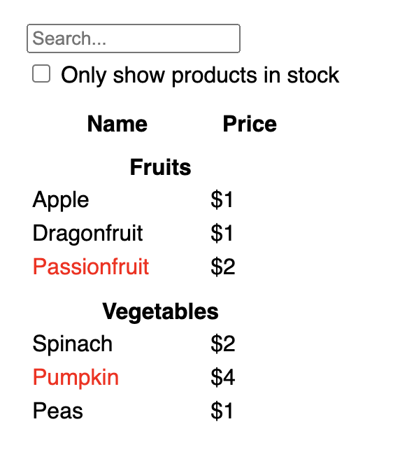 function FilterableProductTable({ products }) { const [filterText, setFilterText] = useState(''); const [inStockOnly, setInStockOnly] = useState(false);